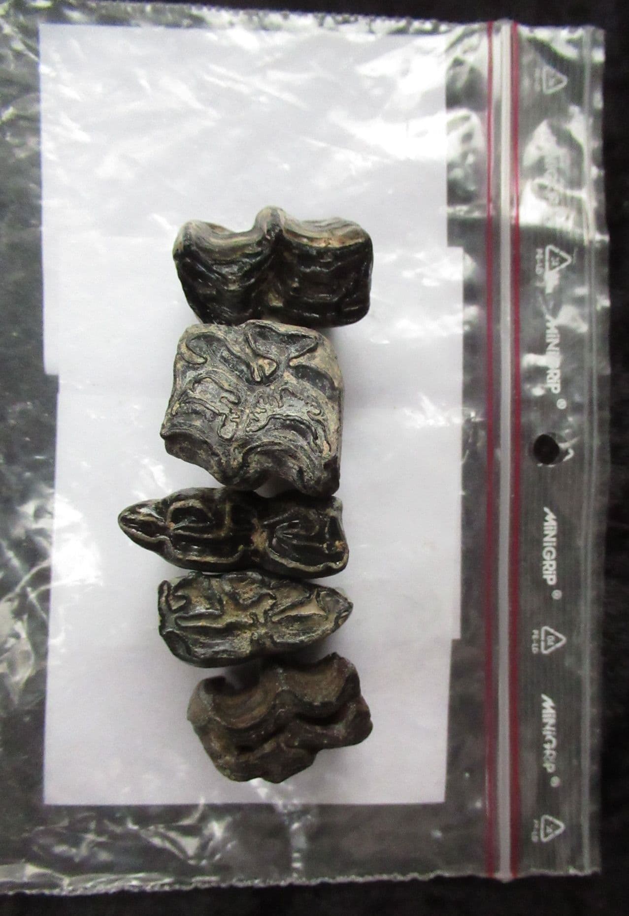 5 beautifully preserved complete teeth from an early species of American horse. Really nice.