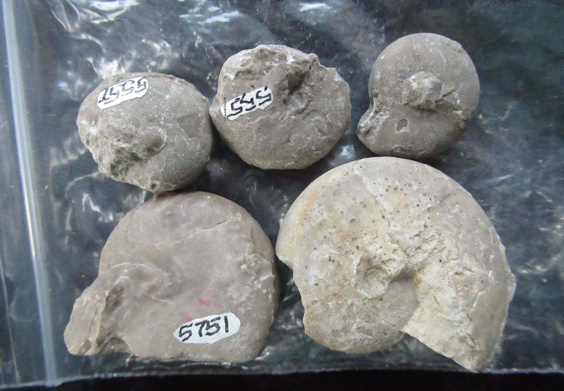5 matrix free Goniatites. . 2 slightly damaged.Classic locality.