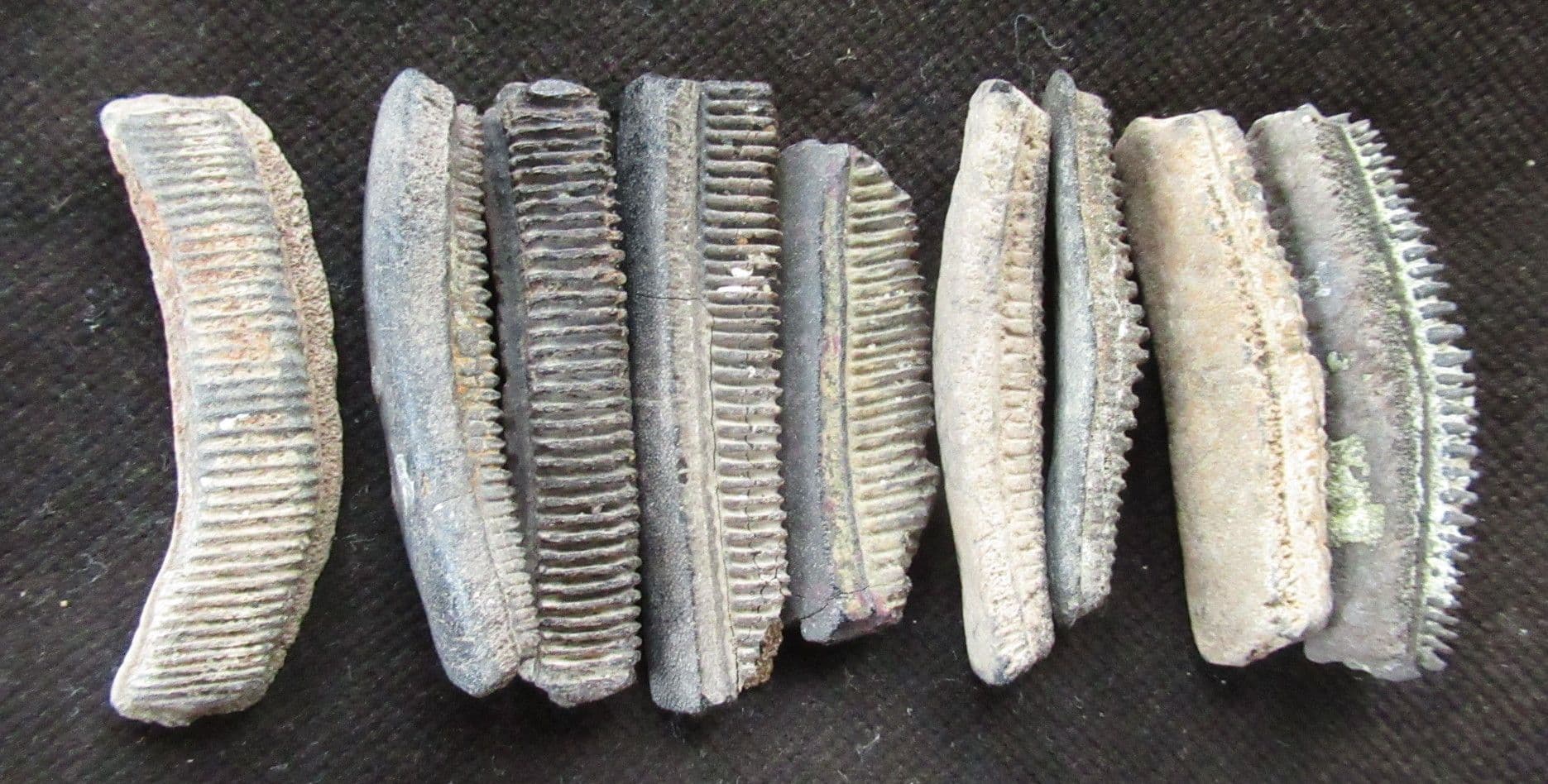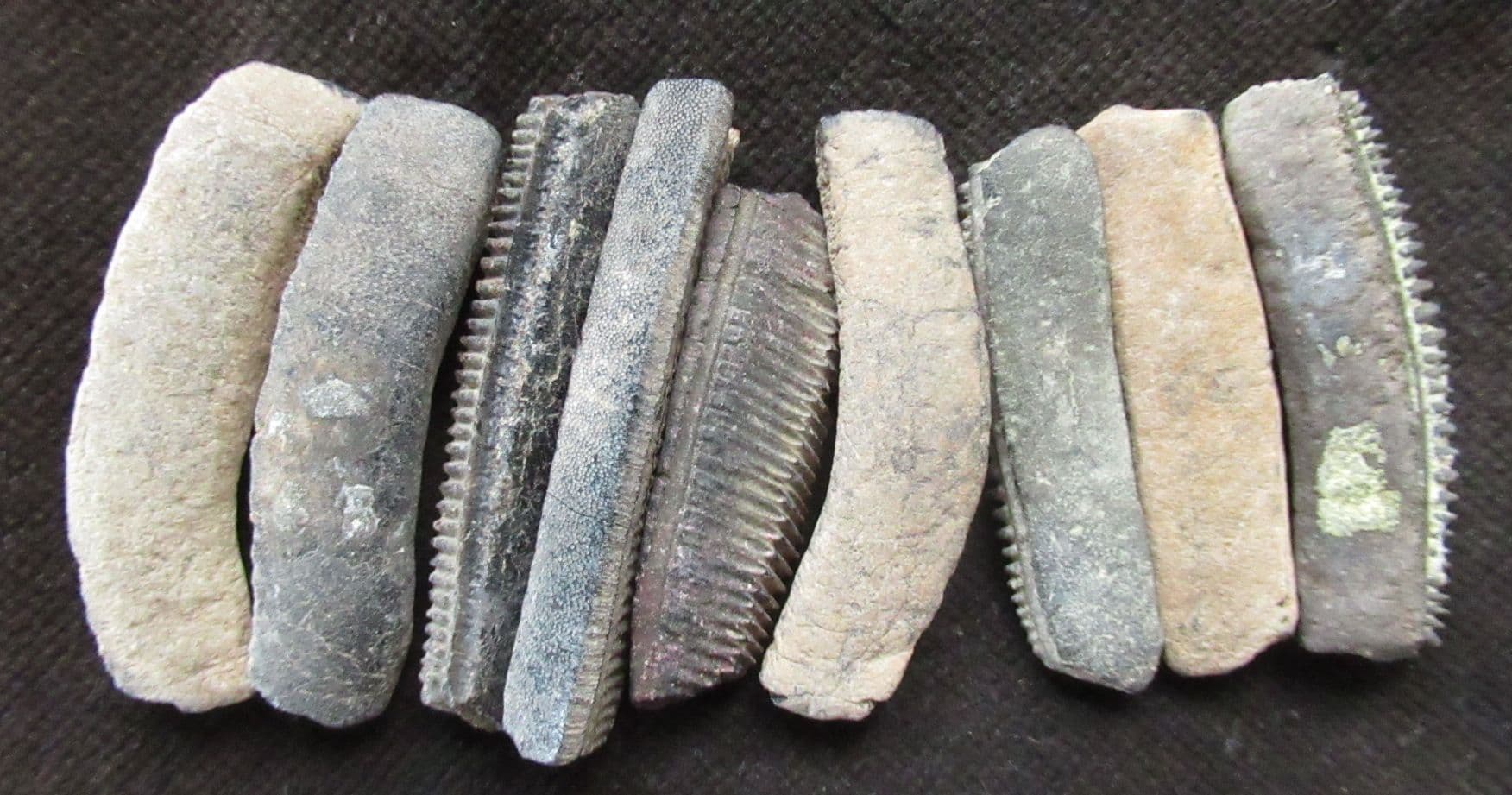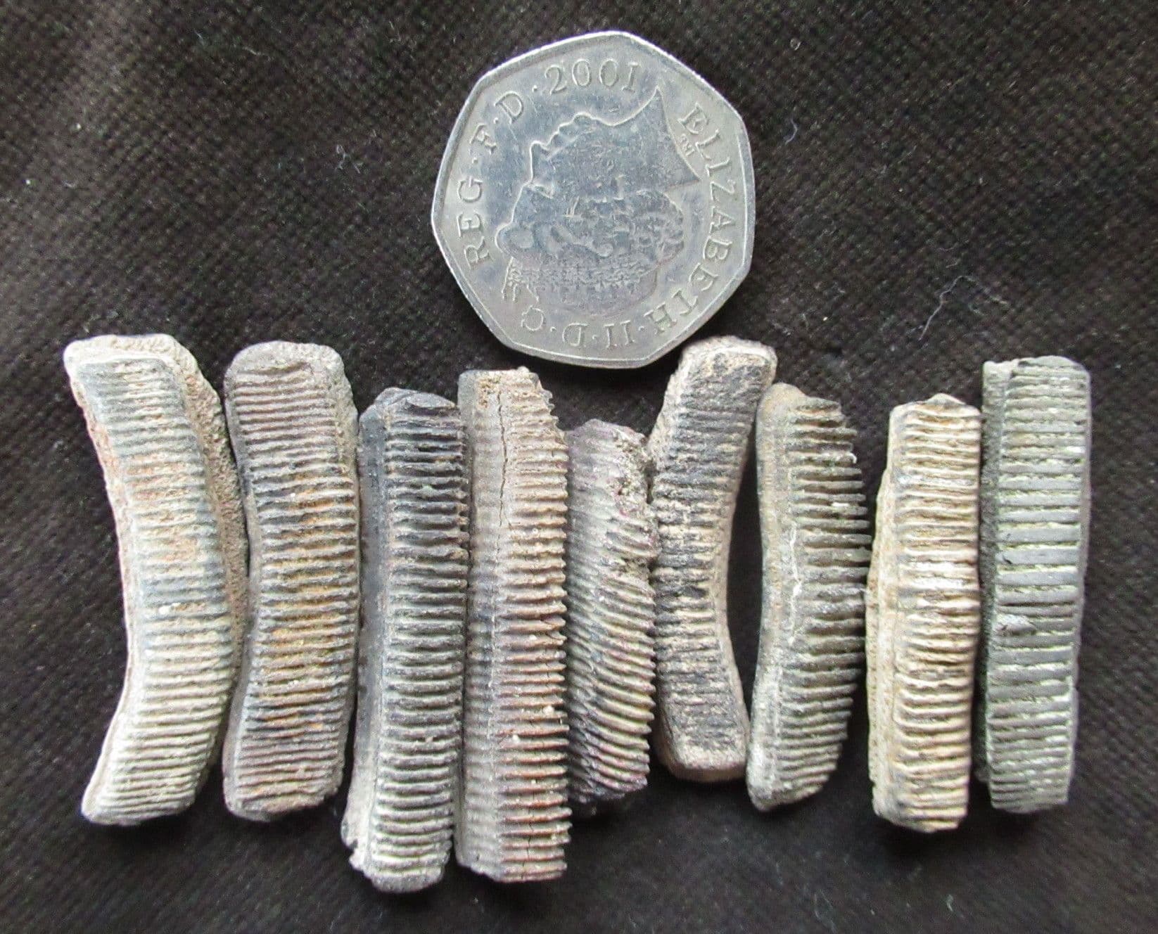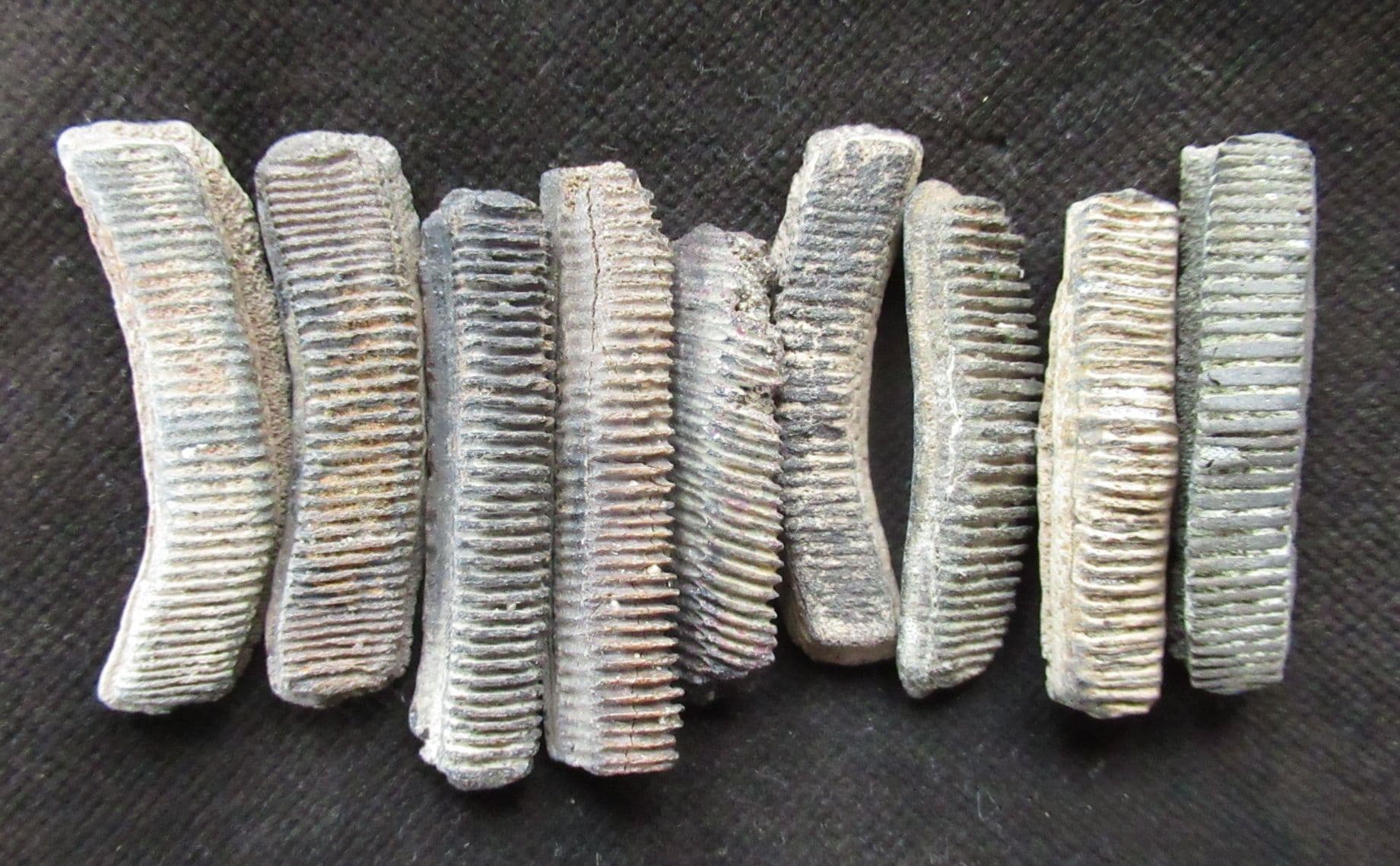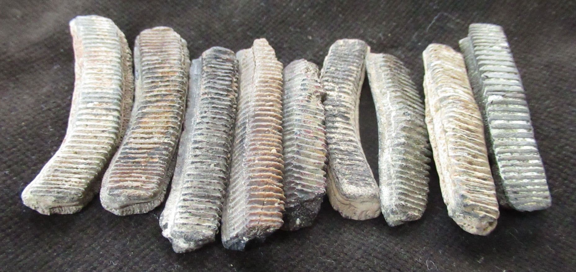 Eagle rays have upper and lower jaw teeth made up long narrow medial teeth forming a crushing platform. A set of 9 perfect large teeth. As good and as big as they come from this famous old locality.