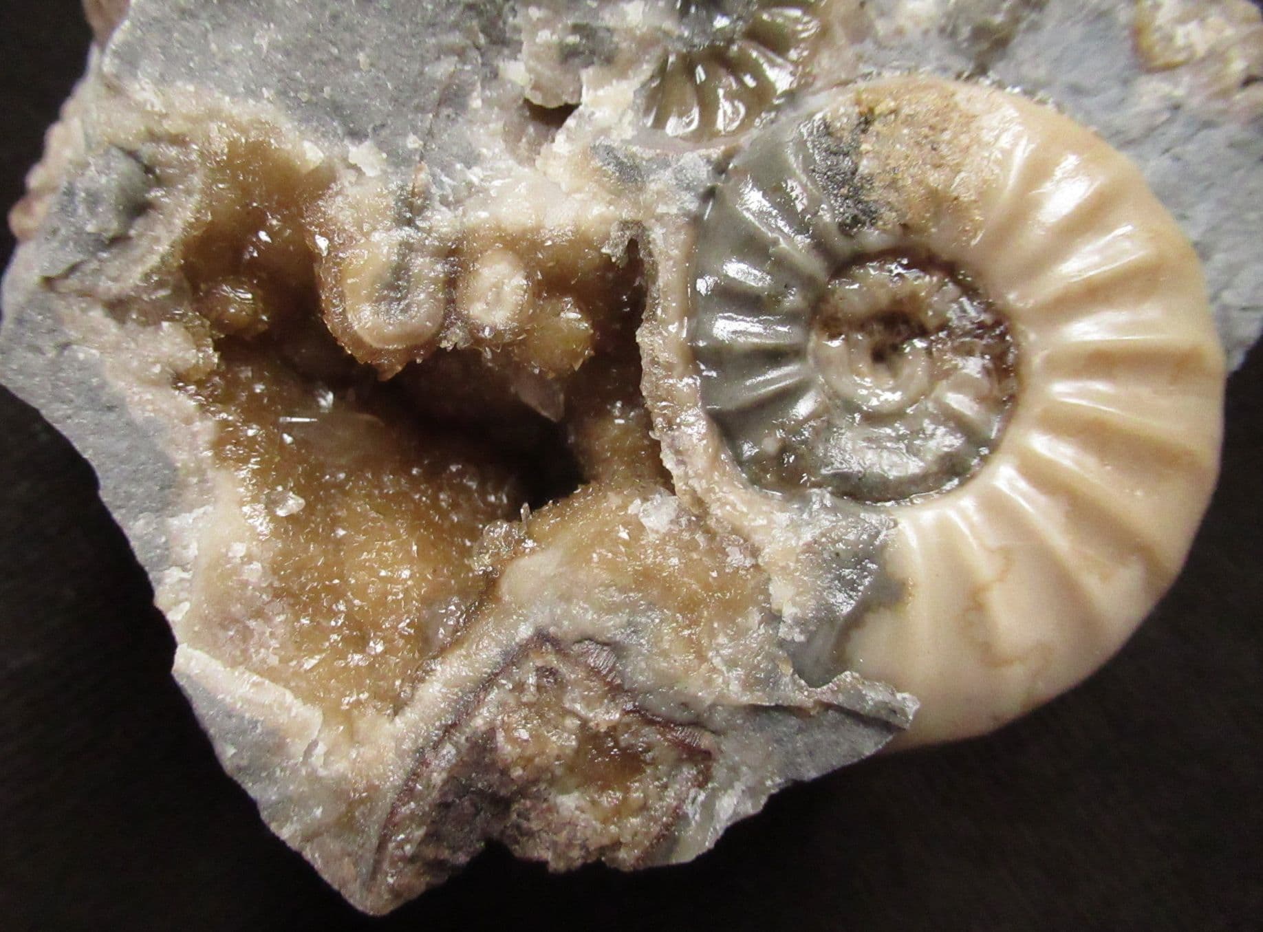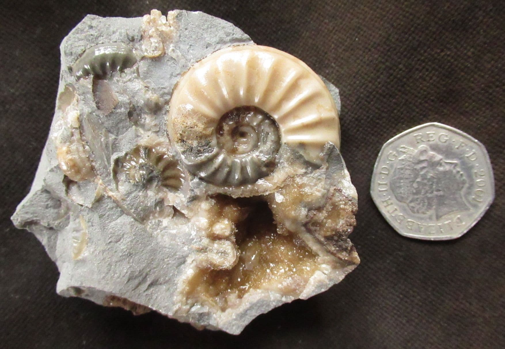 Fine 3D Asteroceras with a large drusy crystal septaria in front of it. Promicroceras and Xipheroceras on the matrix as well.