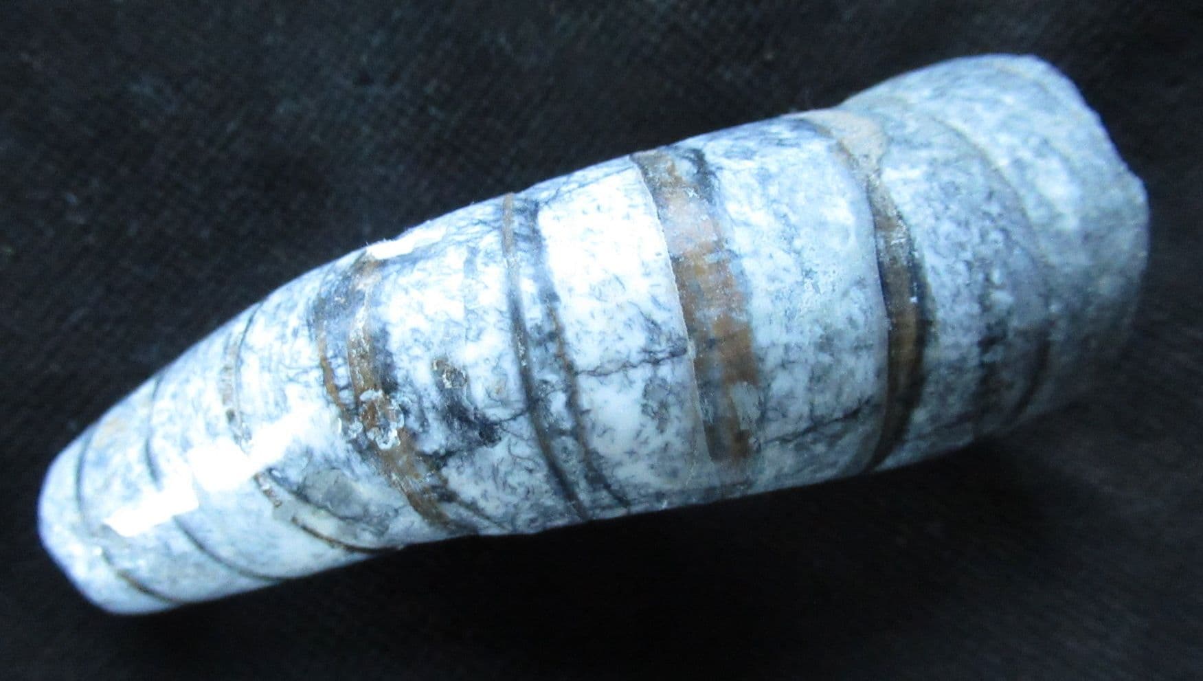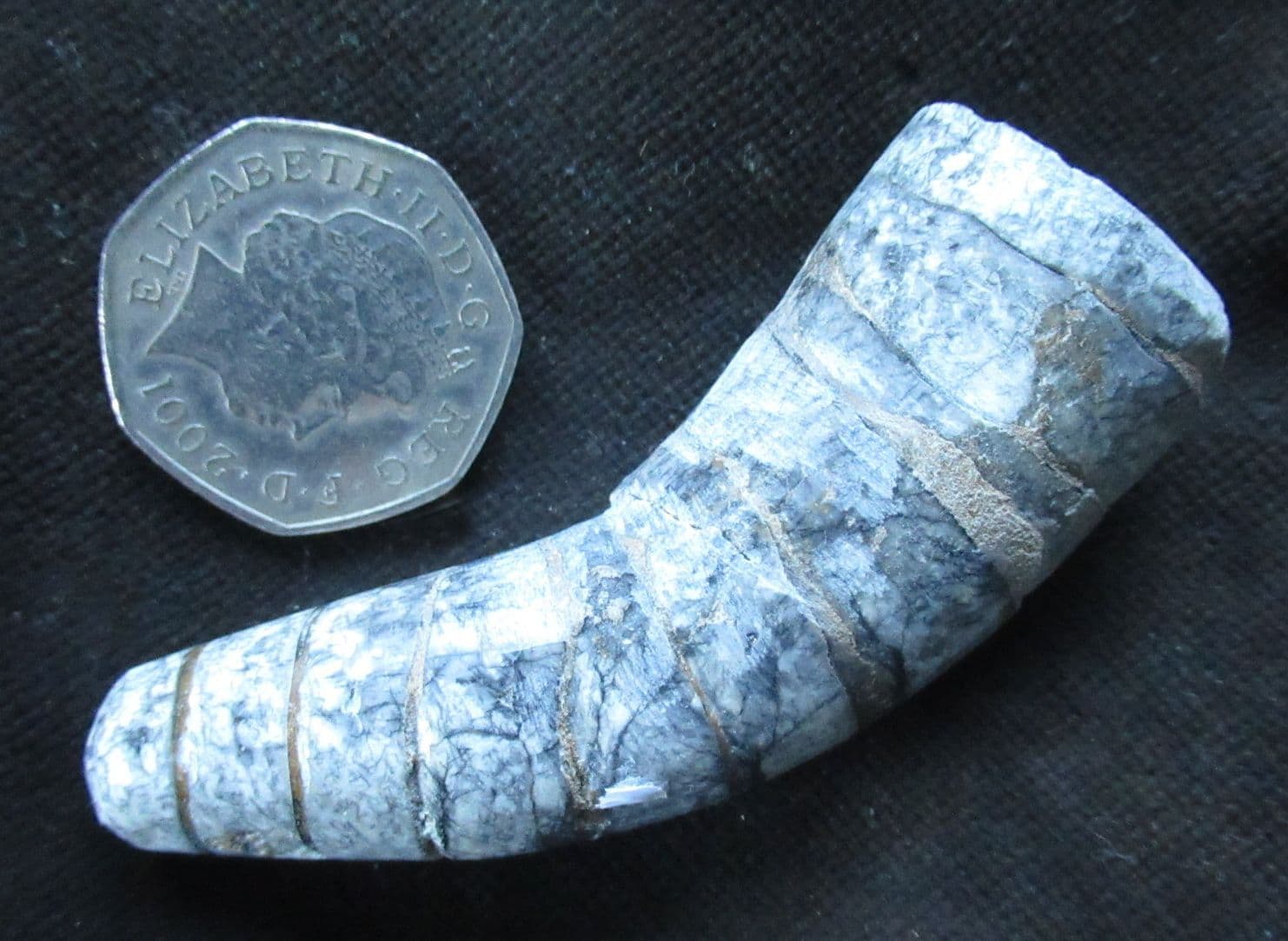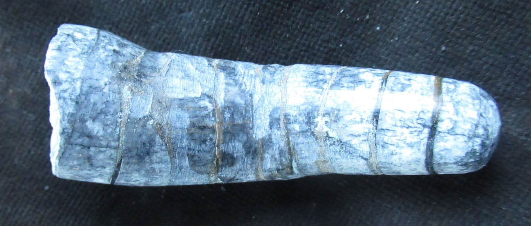 Matrix free Orthocone. The shell should be perfectly straight. Most likely the curvature was due to the action of currents on the sea floor on a weakened shell after death .Really does look like a mummified bent finger.