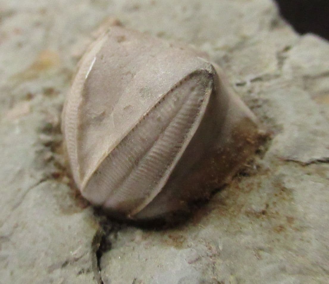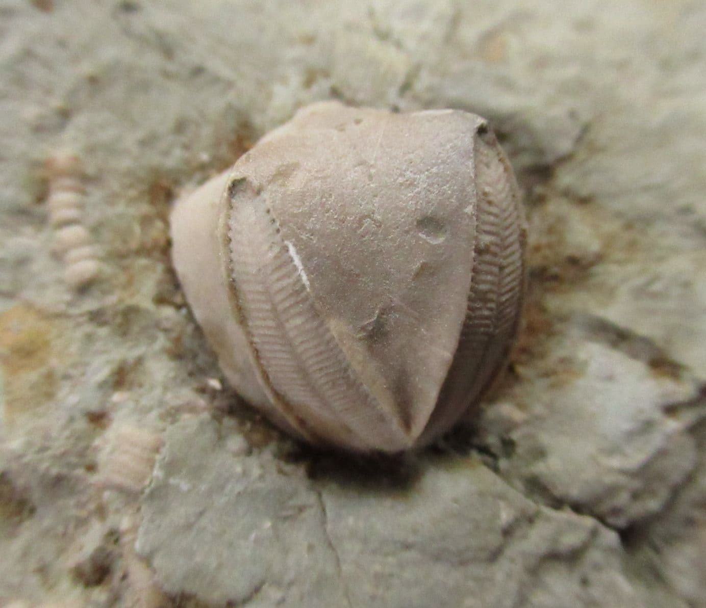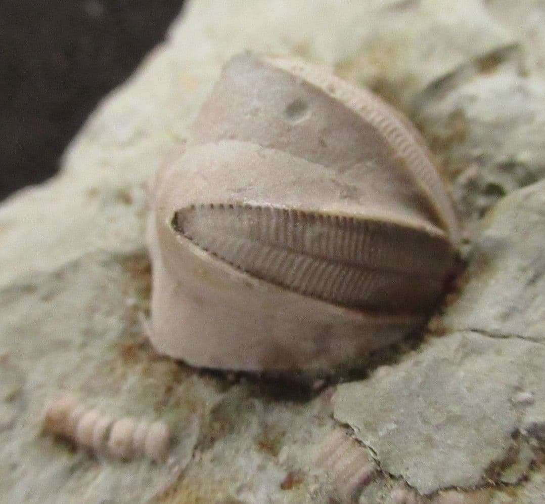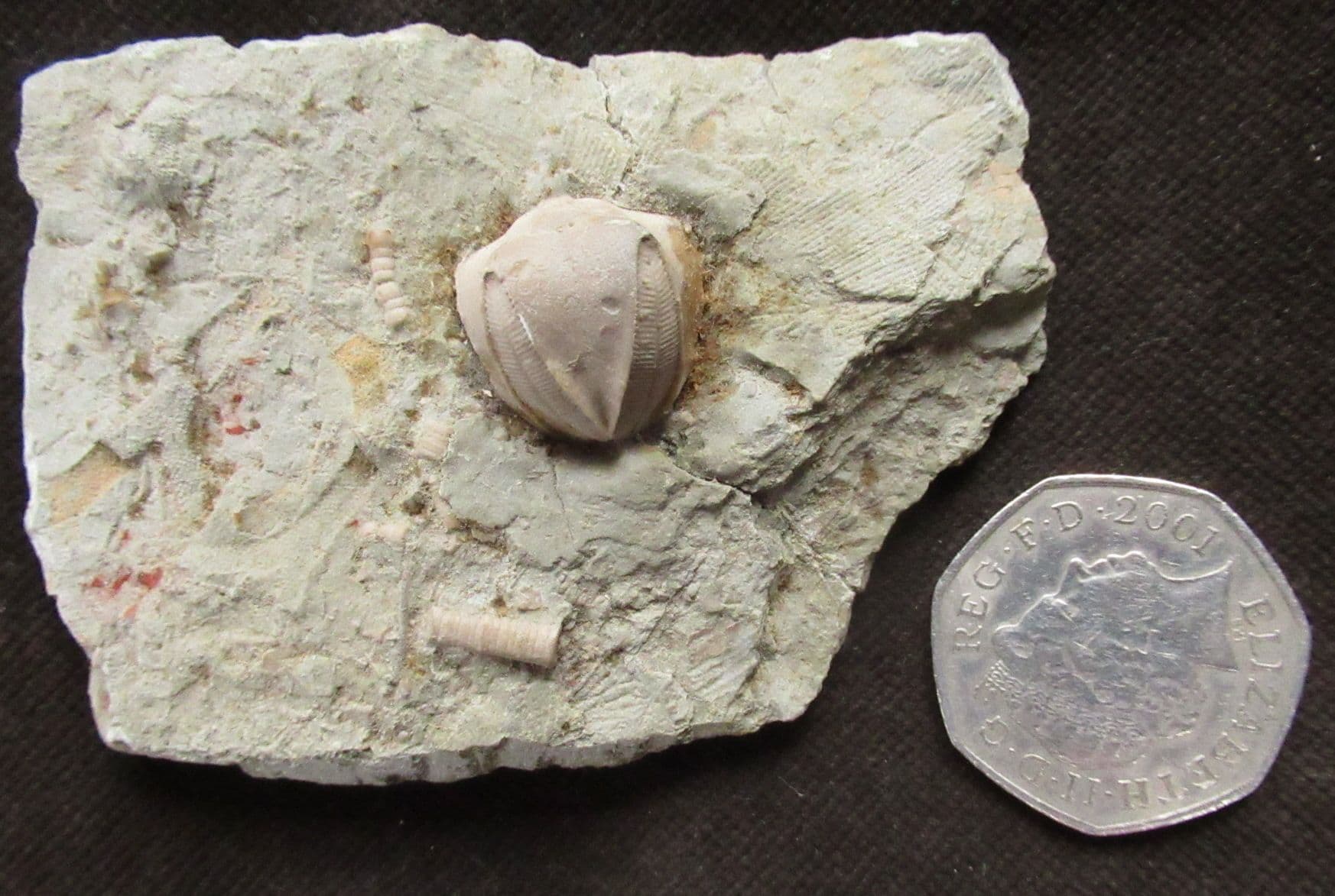 Fine 3D beautifully preserved Blastoid on shale matrix. In amongst Crinoid stems, and both stick and mat Bryozoan colonies. This specimen comes from an unnamed collection. On the reverse in black lettering is the number 103 and the words Blastoid, Ordovician and Siberia. This is clearly a very poor guess as Ordovician Blastoids are not recorded from Siberia and this is very obviously the Carboniferous genus Pentremites. The Bryozoans on the matrix are very characteristic of the Illinois Blastoid finds.