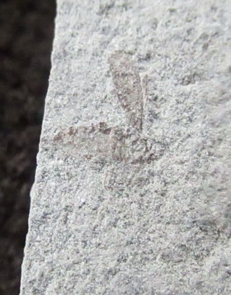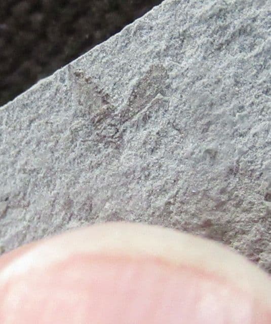 Small square of grey siltstone. With what looks like a bug wit the wing cases open. From a famous insect locality.