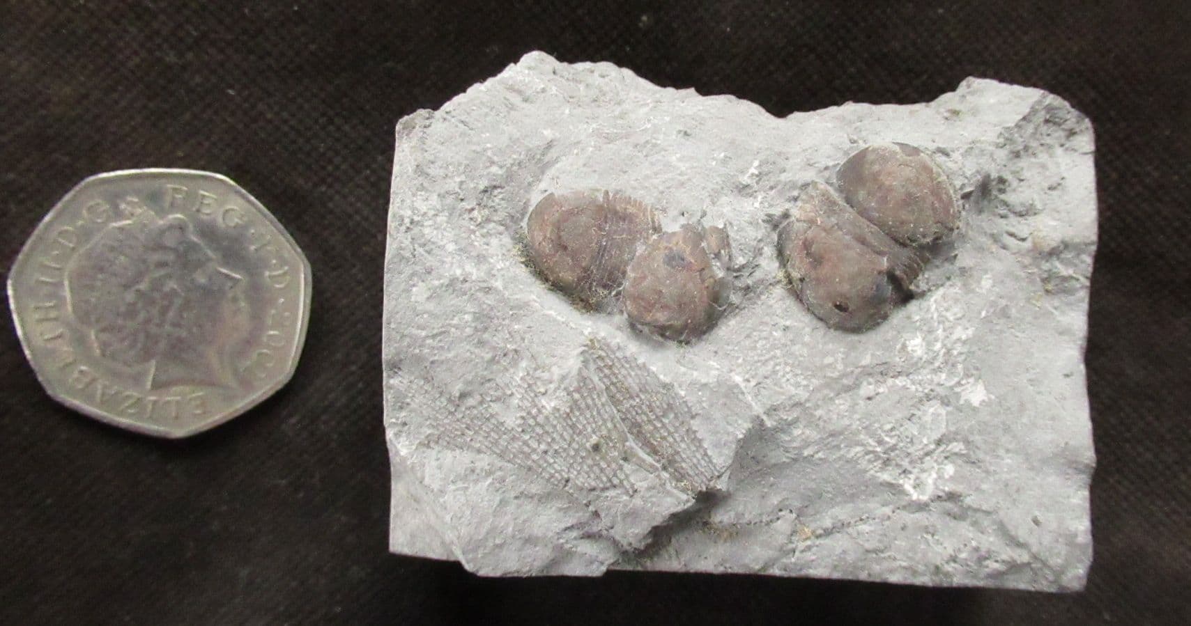 Two well preserved complete Illaenid Trilobites lying next to each other. Both have the librigenes still attached. Both have 100 % original exoskeleton preserved. Double examples of this species from this locality are rarely offered.