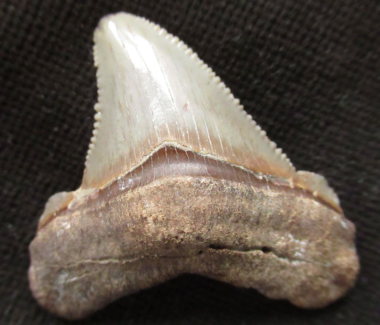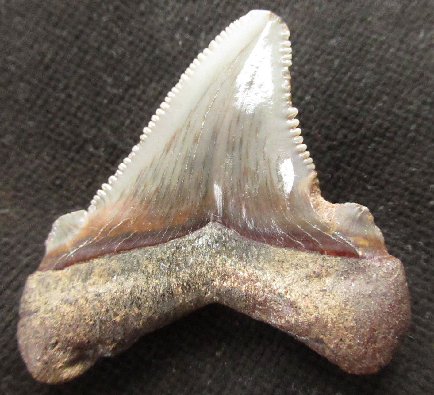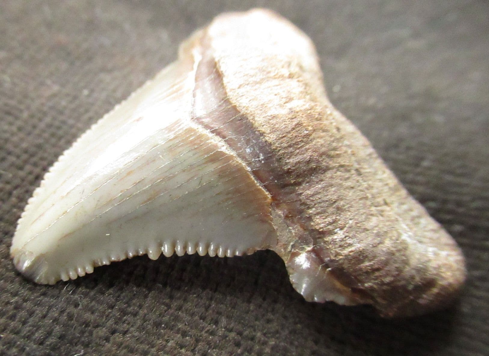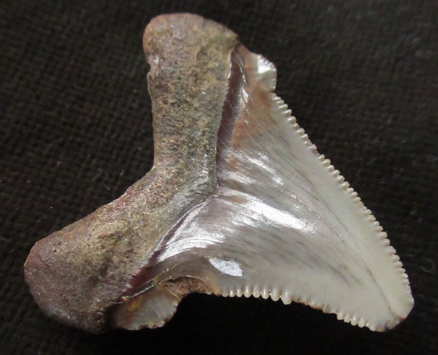 Beautifully preserved Sharks tooth. Shows serrated blade with both serrated side cusps at base. Full root.