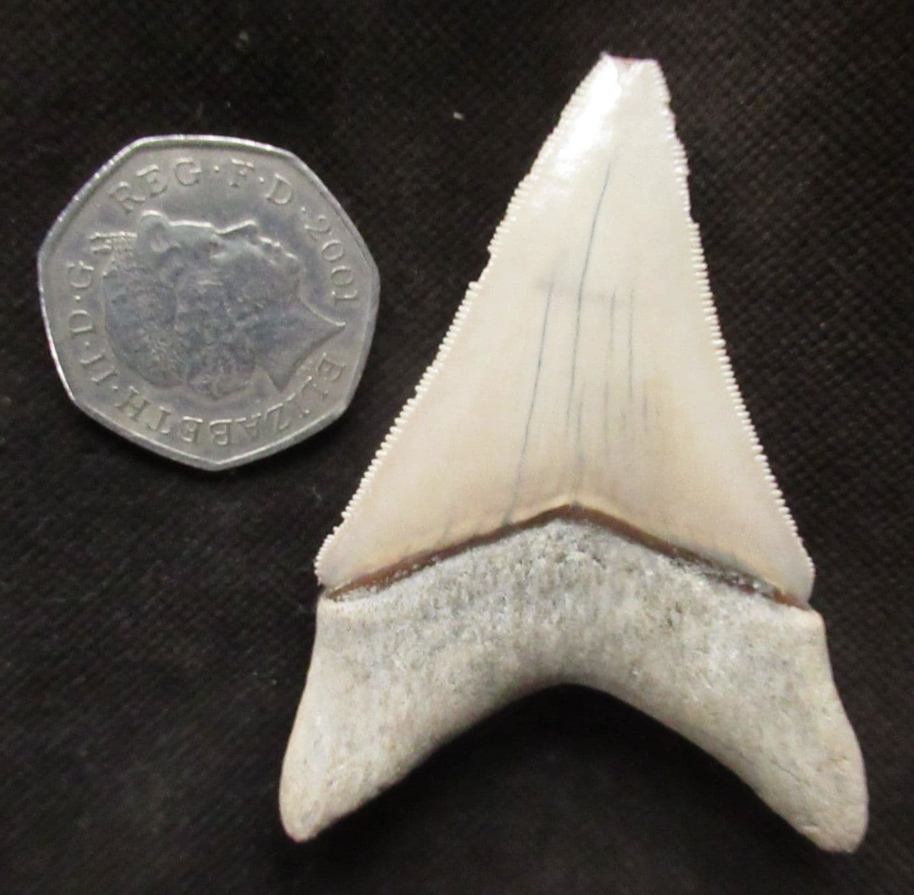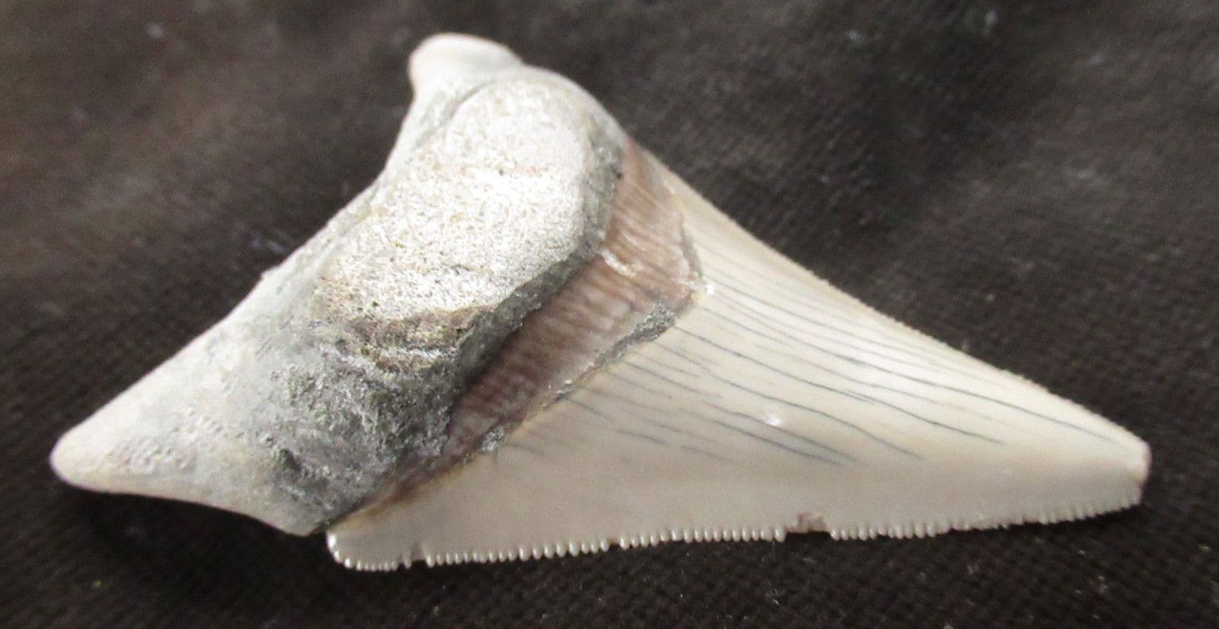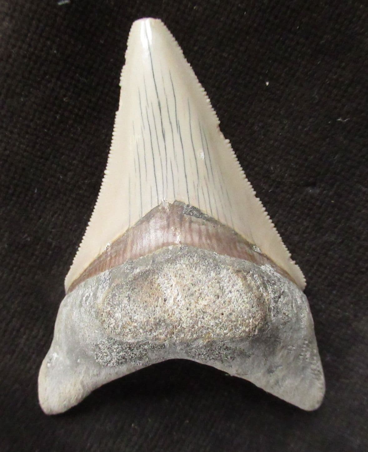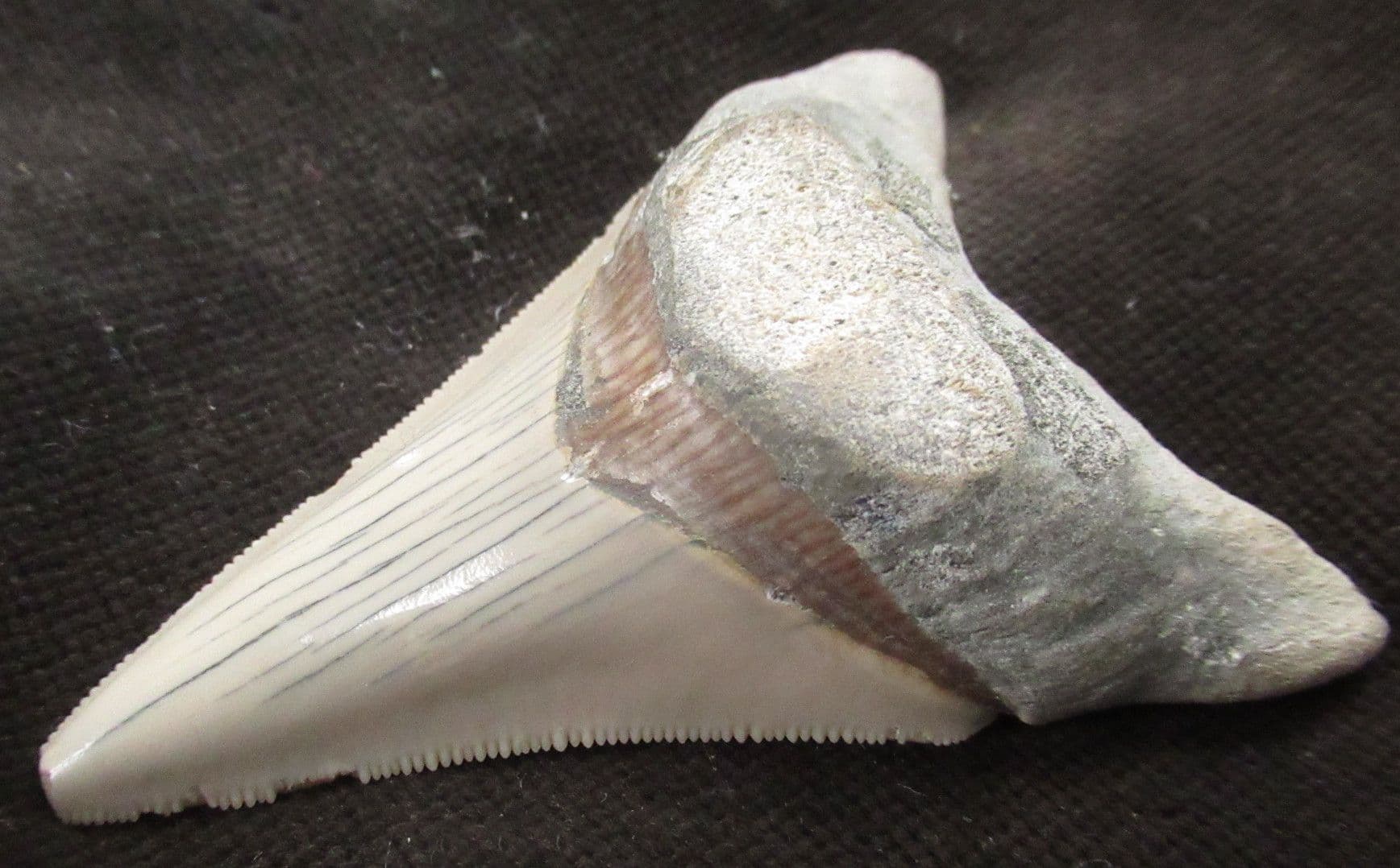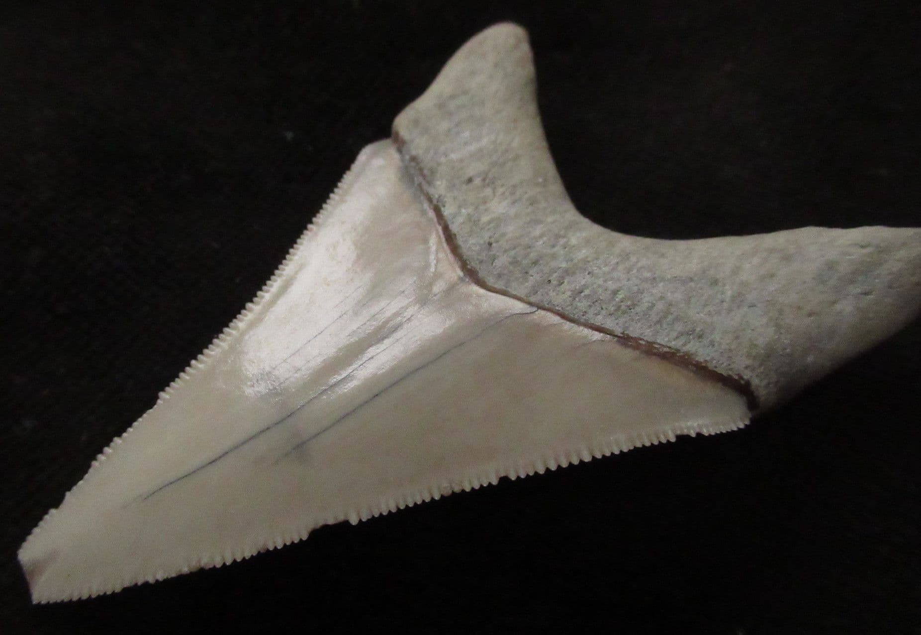 Tooth from a giant extinct shark. Megalodons were the apex predators of the oceans growing to enormous lengths and feeding on Whales other Cetaceans, Pinnipeds and Manatees Tooth shows wicked serrations. The damage to the very tip of the tooth probably occurred in life.