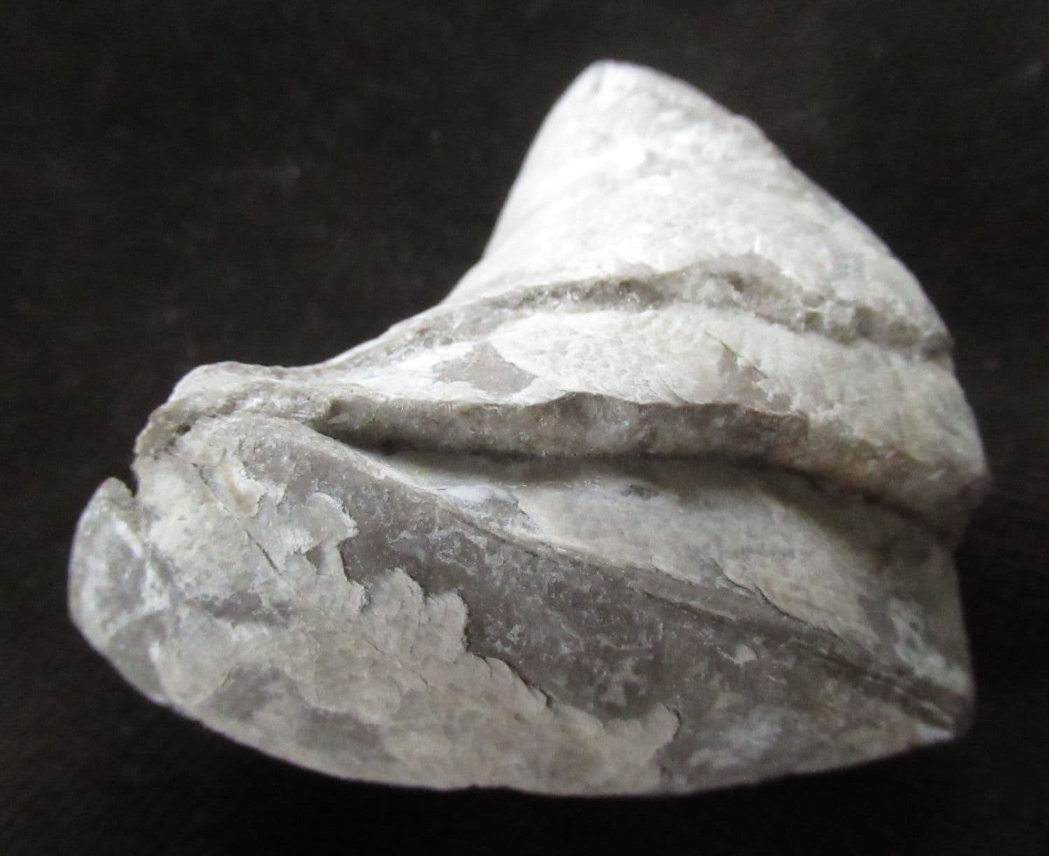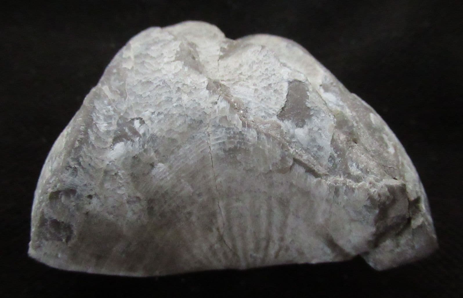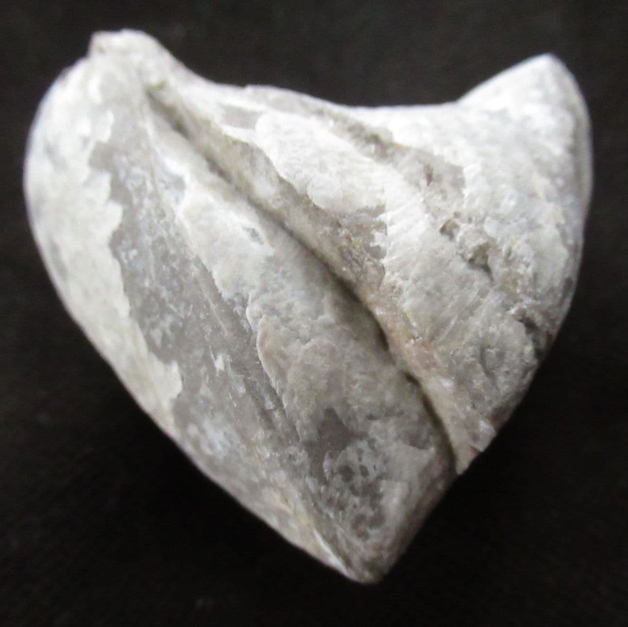 Matrix free Brachiopod. The very deep fold /sulcus is very characteristic of this species. The Brachiopod shows two separate stress fractures.