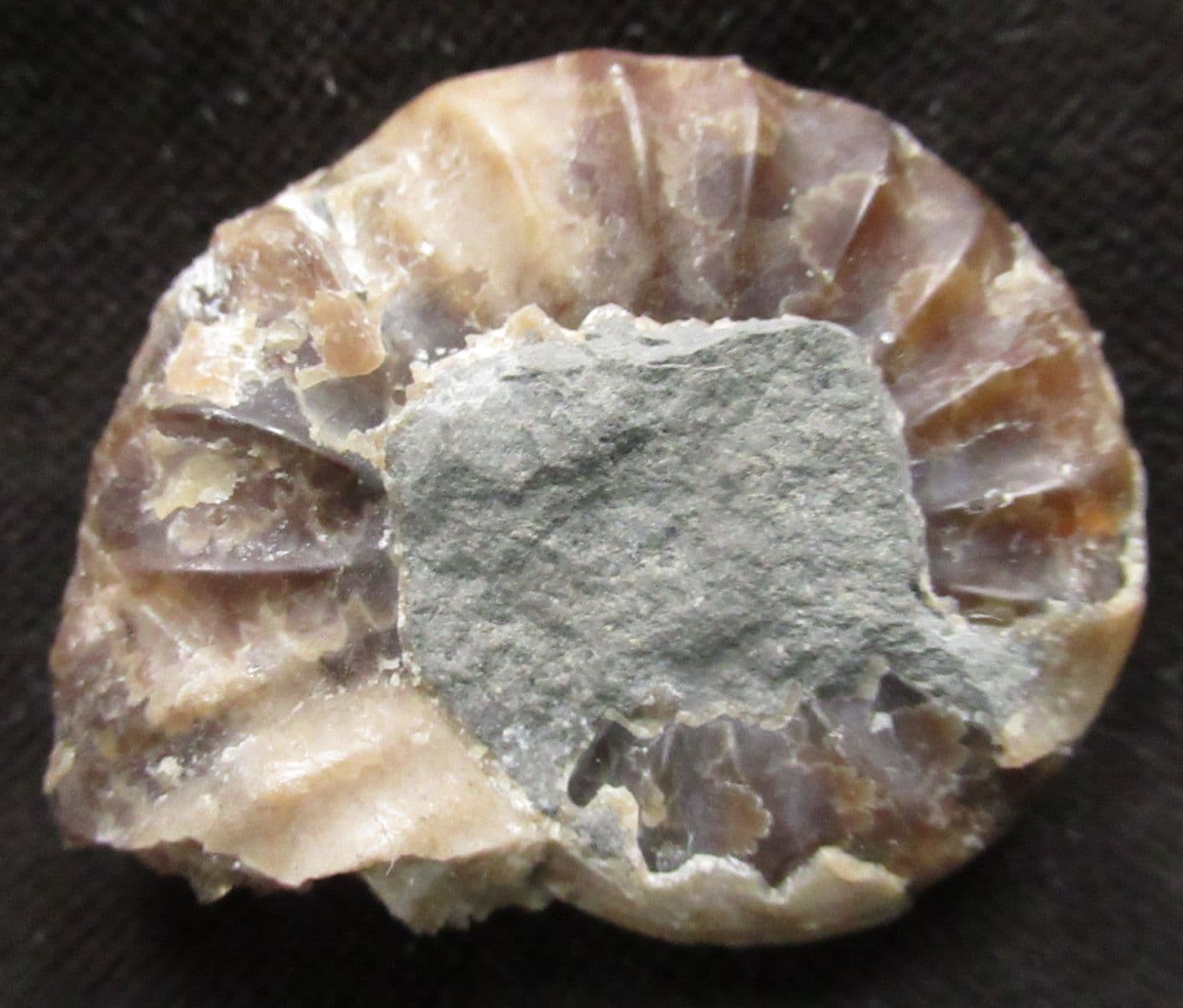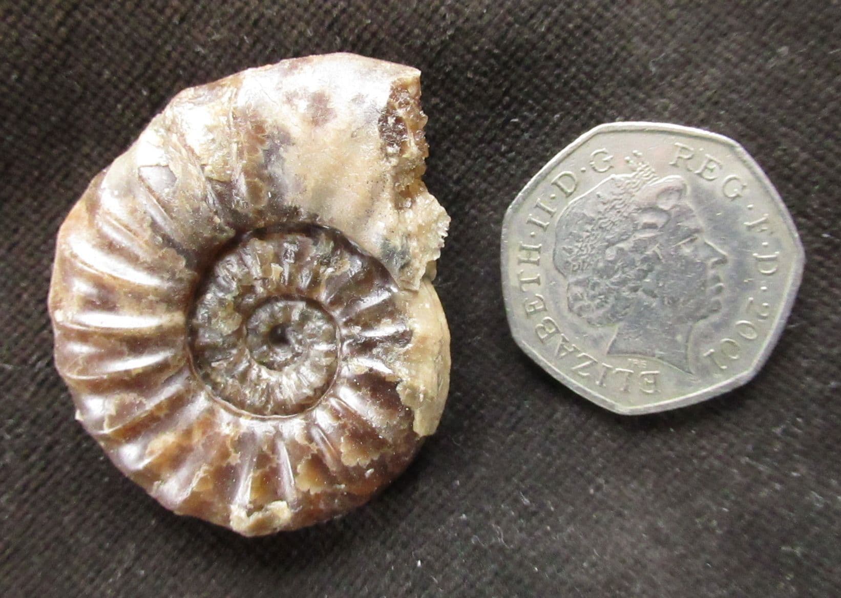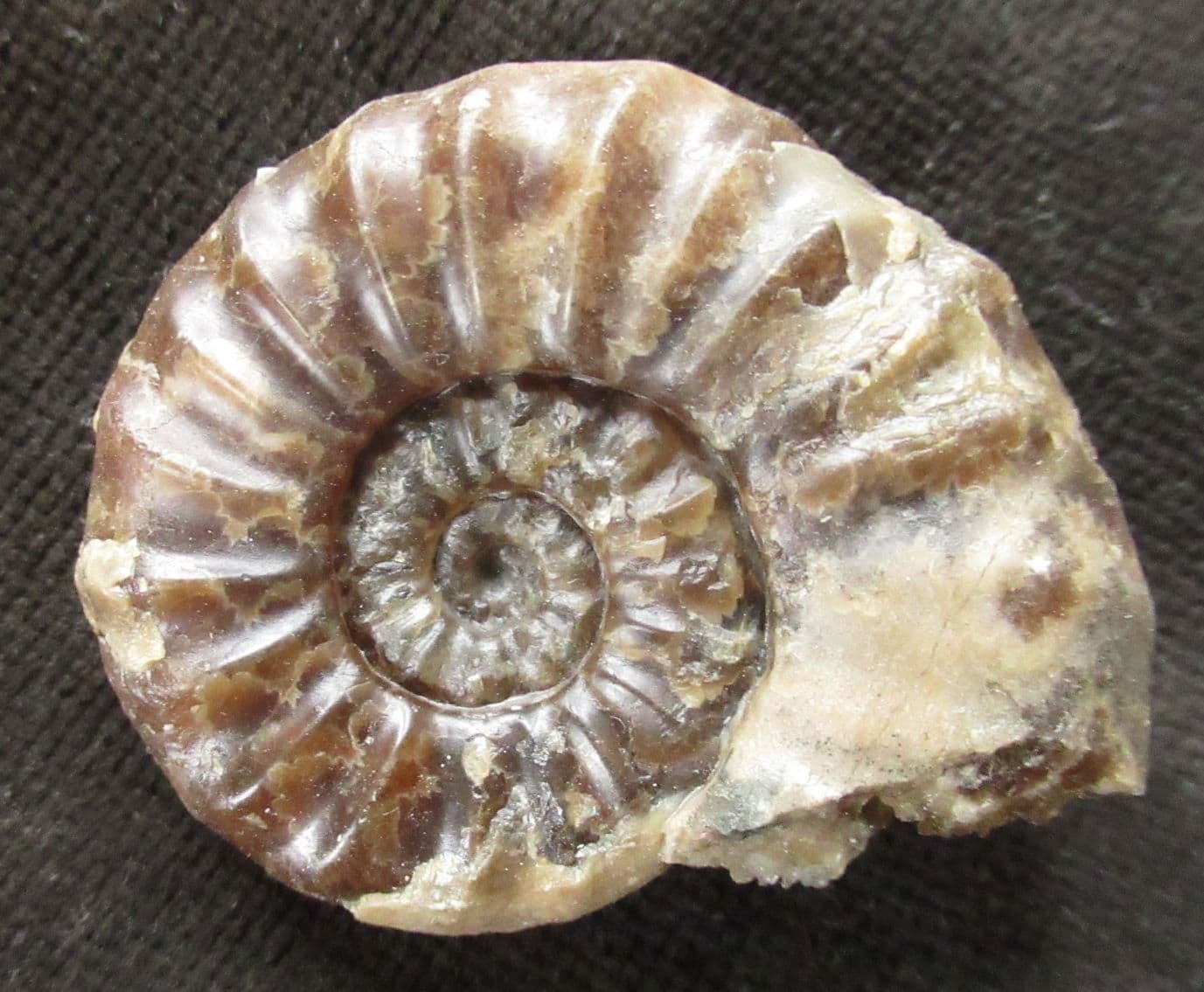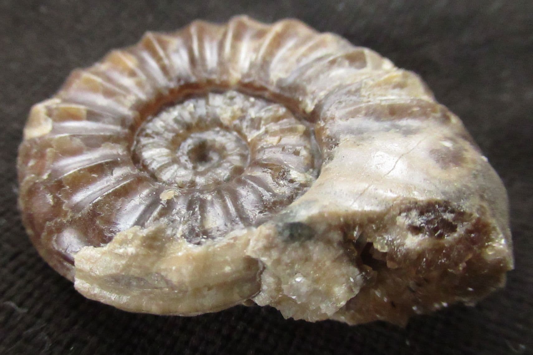 Very attractive brown calcite Ammonite. Developed to centre one side. Nice sutures under magnification. Zonal index species.