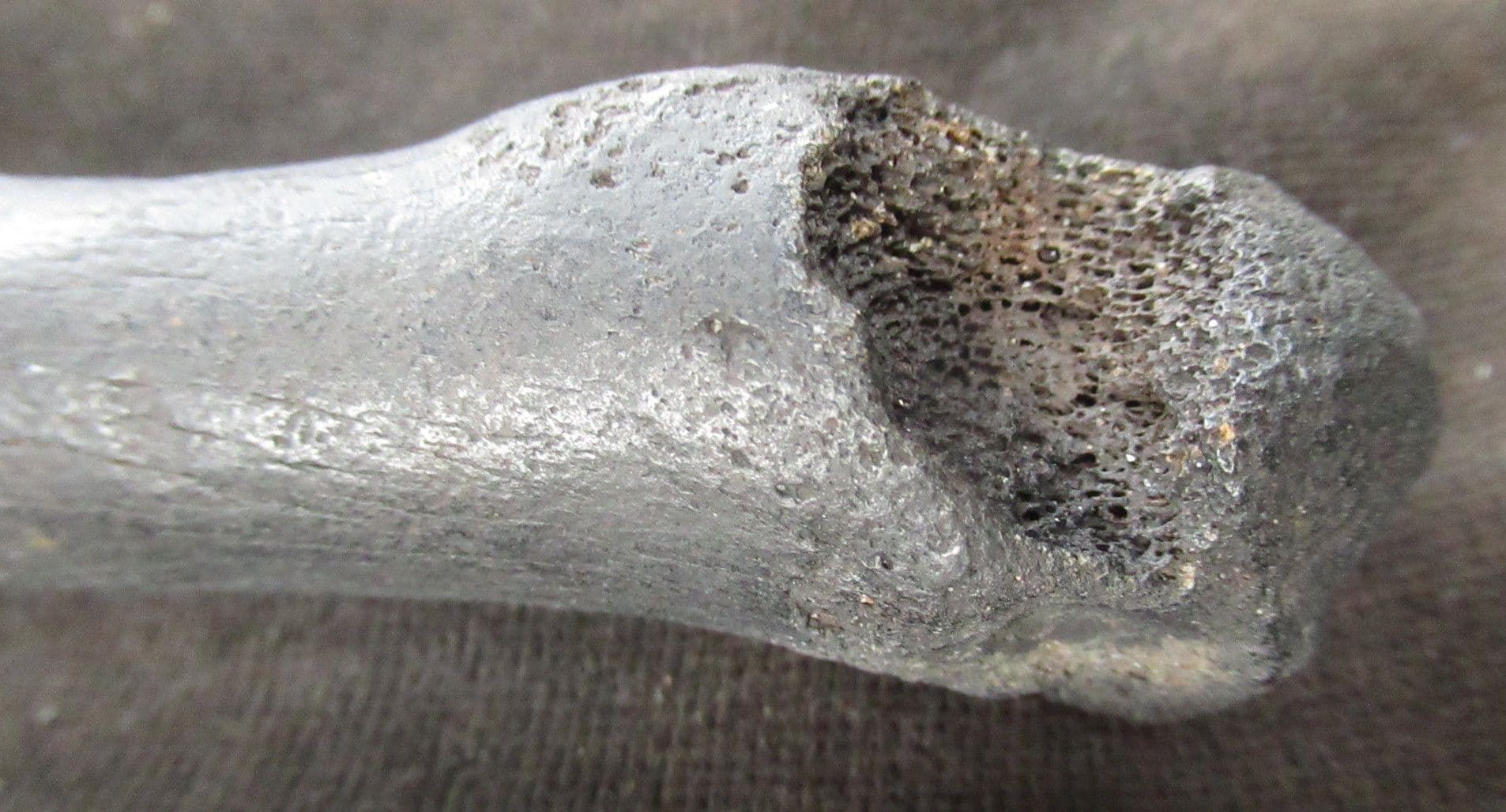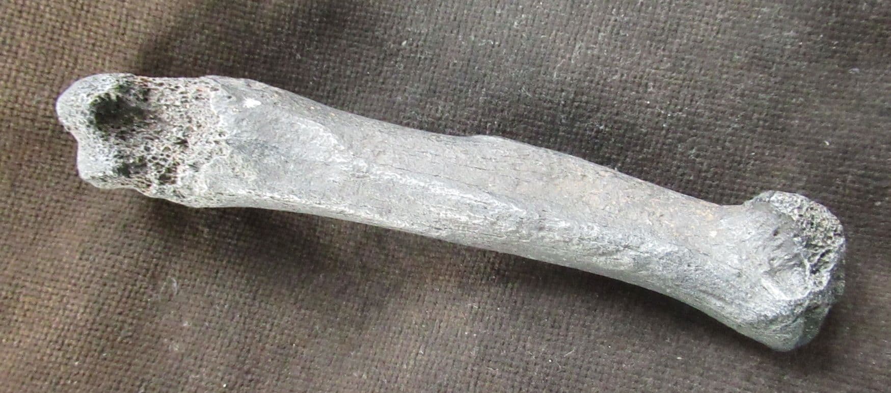 Complete metapodial foot bone from an adult tapir. At the distal end there is a ragged circular hole in the bone. This may just be some form of bone pathology. It could ,on the other hand be the result of a bite from a canine tooth of a large feline of which a Jaguar would be the most likely. Interesting specimen.