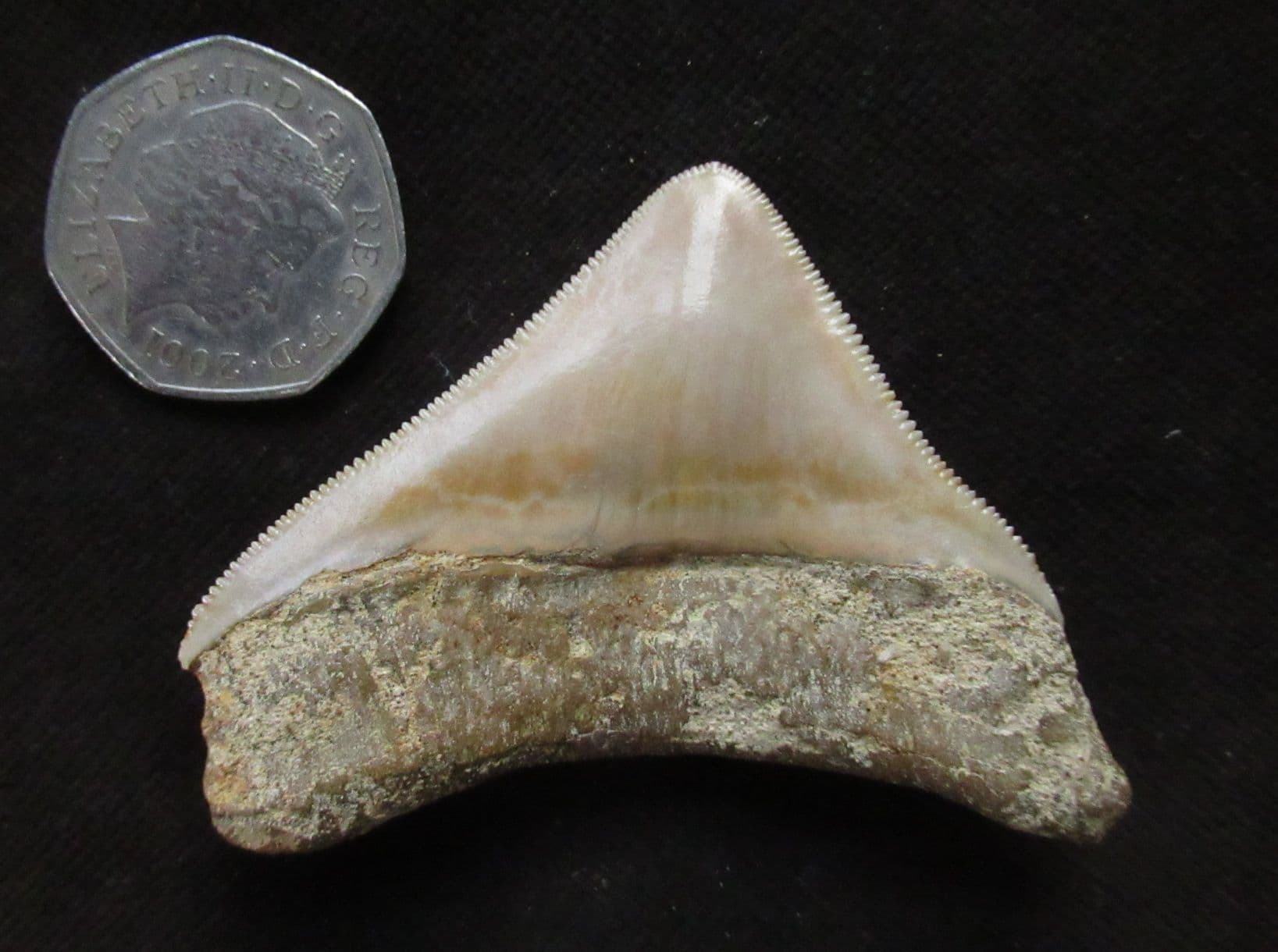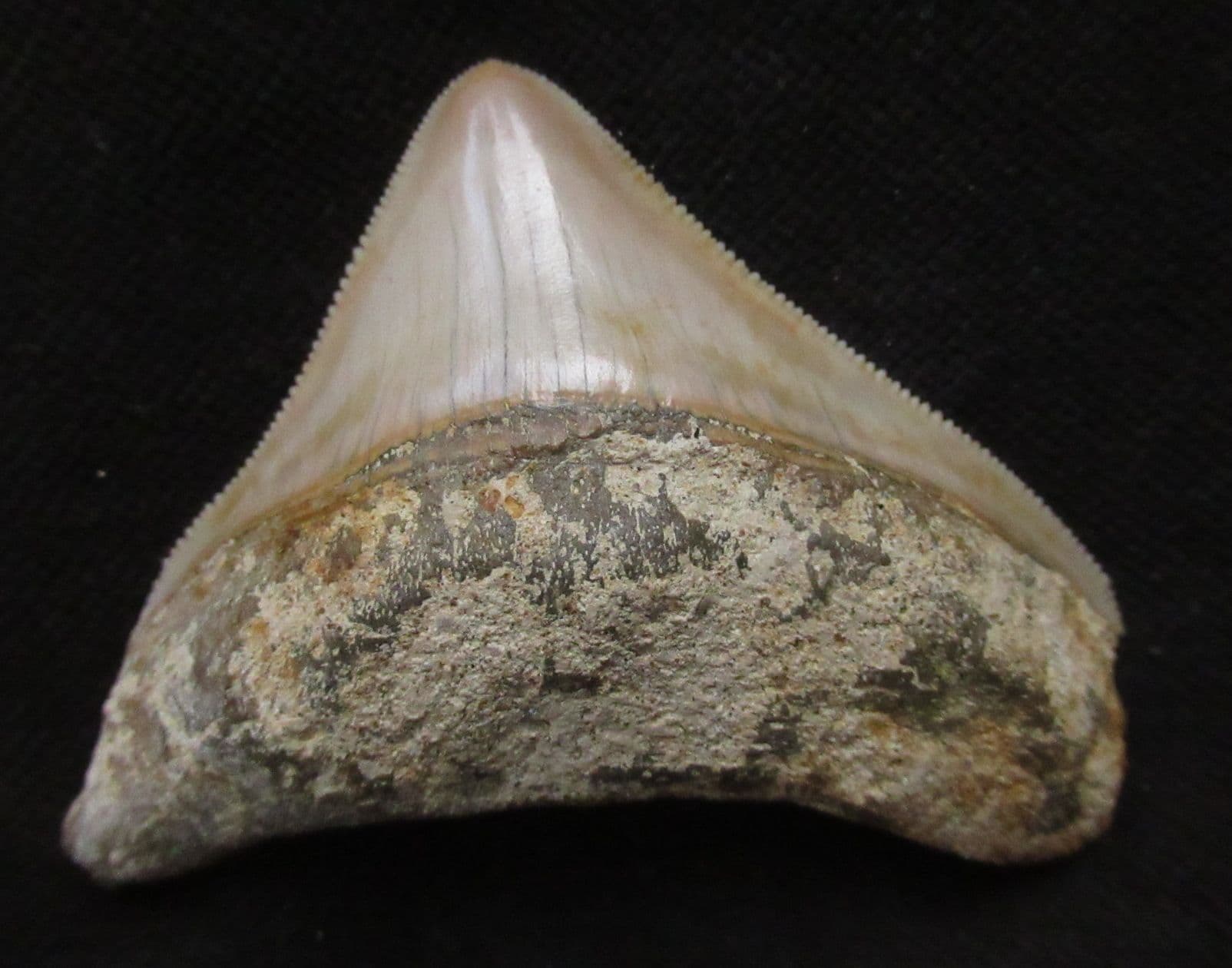 Perfect tooth from an extinct giant shark. The wide triangular blade shows wicked serrations along both edges.Teeth from this particular locality usually have poor roots. This was has an excellent rooth. A ;beauty.